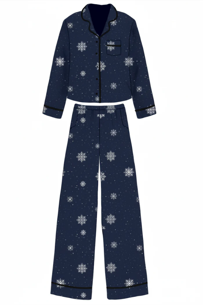 Style notes: Step into the serenity of the season with our Aspen Dream PJs, a timeless navy design scattered with delicate snowflakes. Crafted from our signature ultra-soft bamboo-blend fabric, this set offers breathable comfort and a silky-smooth feel that’s perfect for lounging, sleeping, or gifting.