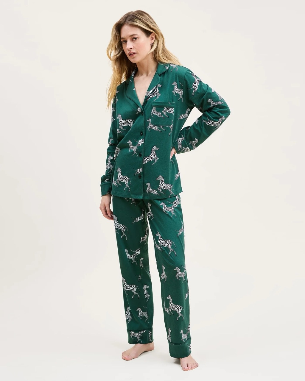 Luxurious, supple pima cotton knit pajamas from Petite Plume that drape beautifully and continue to soften with each washing. Graceful zebras on a stunning, rich green background.