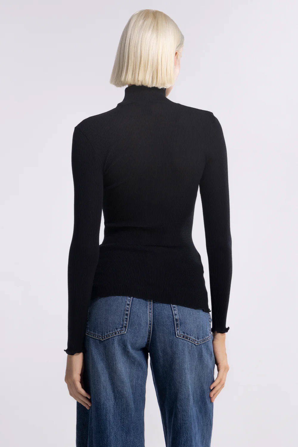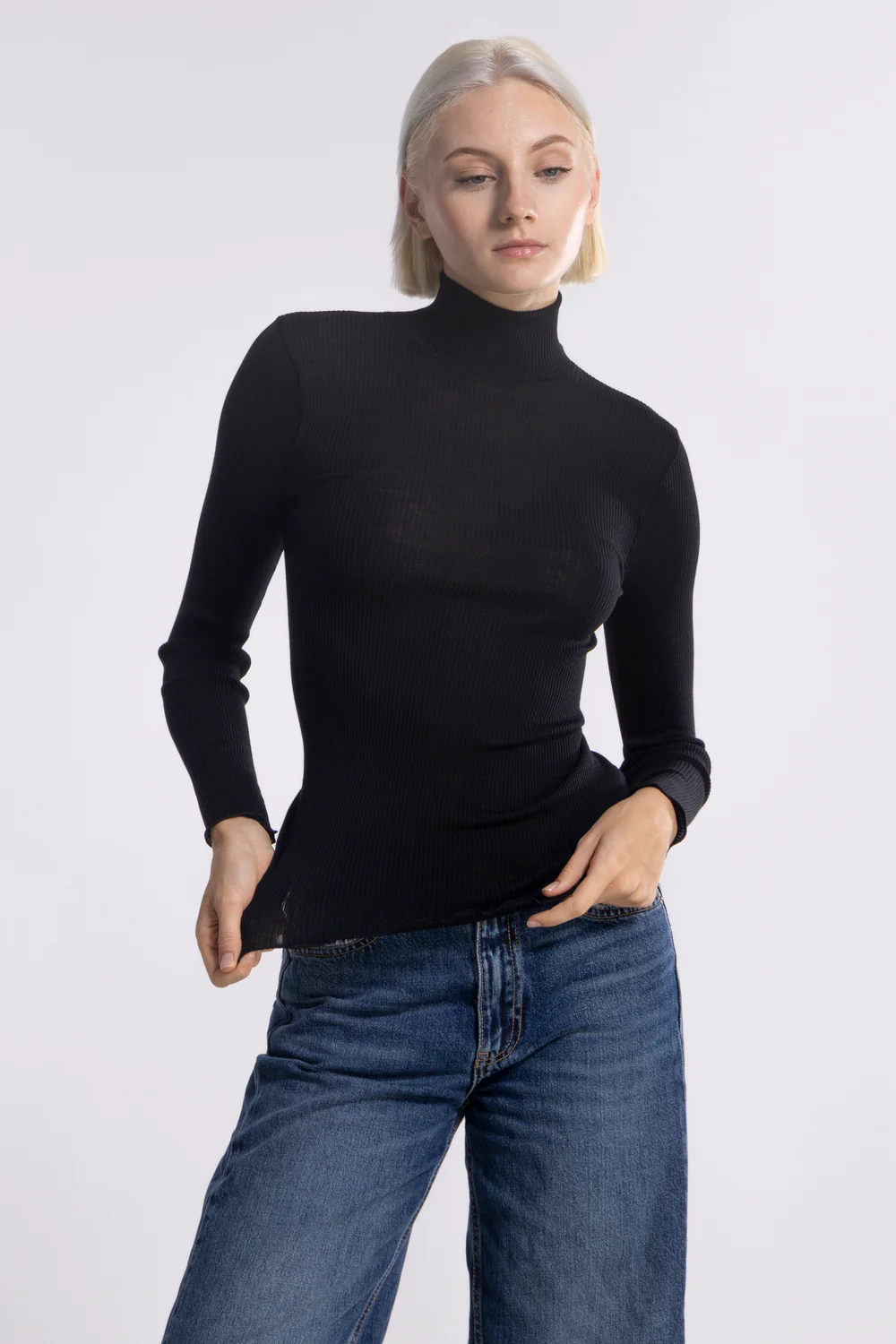 • A mock-turtleneck made of a delicate rib knit fabric blend of Merino wool and pure silk from Italian brand Oscalito. Perfect for layering or as an elegant top.